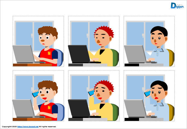 テレワーク中の男性のイラスト、在宅ワーク、在宅業務、持ち帰り作業、パソコン作業、スマホしながら作業、フチ有りフチ無しなど12種類