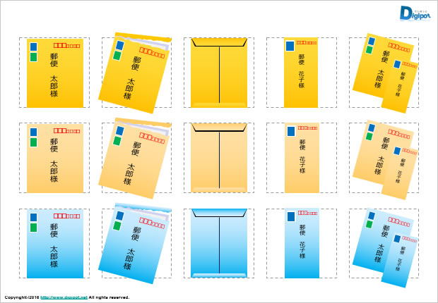 フリー、無料で使える封筒、ハガキのイラスト画像です。PPTX形式、PNG形式画像で、フチありフチなしの2パターン作成しています。