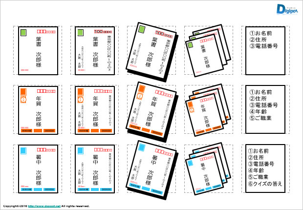 ハガキ、年賀はがき、暑中見舞いはがき、表面、裏面、記入サンプル、複数など