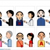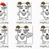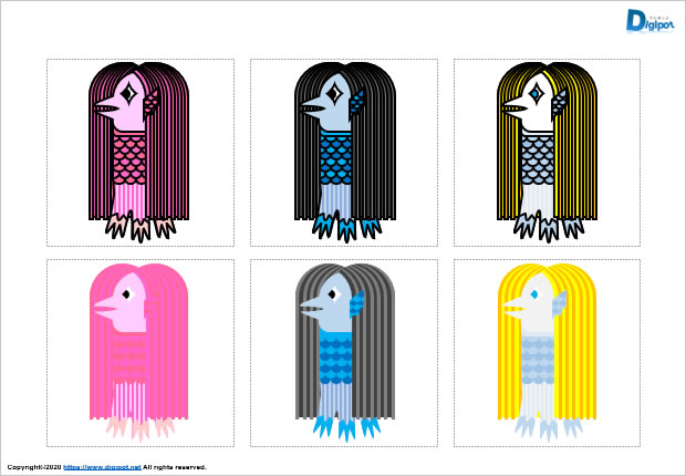 アマビエのイラスト、デフォルメしたアマビエ、正面から見たアマビエ、カラーバリエーション、フチ有りフチ無しなど12種類