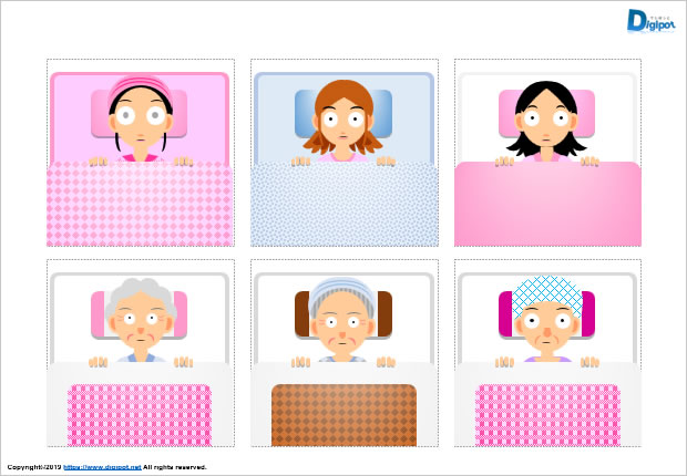 眠れない女性のイラスト、不眠、布団に入る、目がさえる、目覚め、フチ無しフチ有りなど12種類