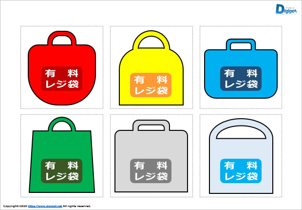 取っ手型の買い物レジ袋外観図形、有料レジ袋の文字入り、各種形状、カラーバリエーションなど12種類