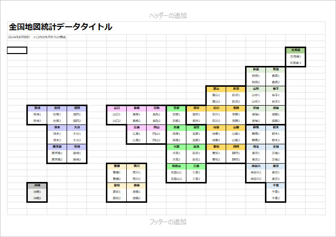 データや数値入力を主目的とした日本地図風のテンプレートです。都道府県別にエリア分けされたスペースに文字や数値を入力して資料を作成するテンプレートです。状況報告、データ分析の報告書などにご活用ください。また、セルをベースに作成していますので、セルのサイズや文字のサイズを極端に大きくするとレイアウトが崩れますのでご注意ください。