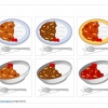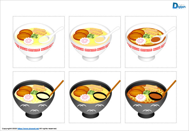 スープの色味が違います。薄め、普通、濃い目と塩、とんこつ、味噌などのイメージの使い分けができます。ラーメン販売の案内などにご活用ください。