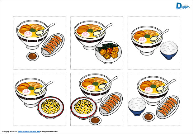 ラーメンセットのイラスト、ラーメン餃子セット、ラーメンライスセット、ラーメンチャーハンセット、ラーメン唐揚げセット、フチ有りフチ無しなど12種類