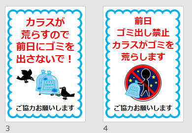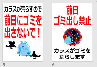 「カラスが荒らすので前日にゴミを出さないで!」「前日ゴミ出し禁止カラスがゴミを荒らします」の文字のみ、「カラスが荒らすので前日にゴミを出さないで!」「前日ゴミ出し禁止カラスがゴミを荒らします」と文字とイラスト、枠有、枠無し、白黒、イラストアイコン付き、A4サイズ縦横など12パターン。