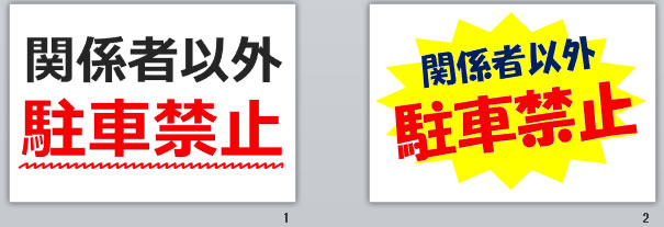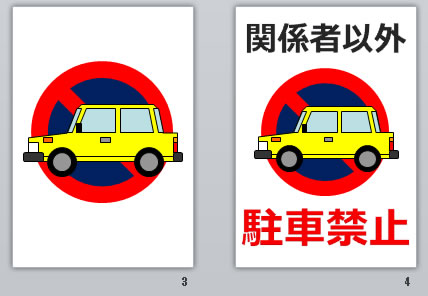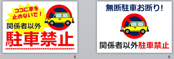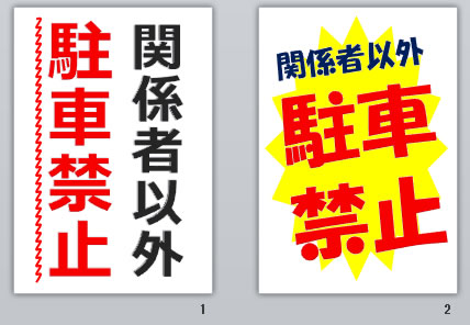「関係者以外駐車禁止」の文字のみ、「関係者以外駐車禁止」とアイコン表示などA4縦/横