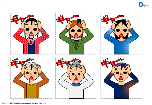 絶叫する女性のイラスト、叫ぶ、驚く、おばあちゃん、OL、フチ有りフチ無しなど12種類