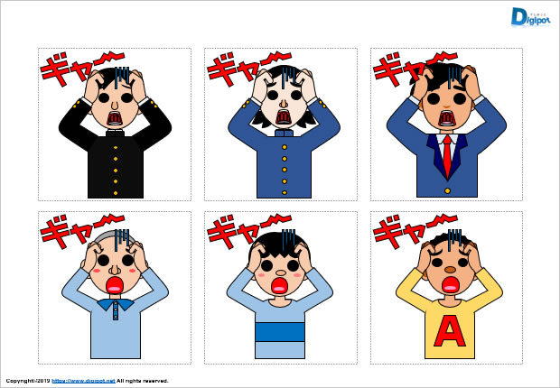 絶叫する男の子のイラスト、叫ぶ、驚く、小学生、中高生、フチ有りフチ無しなど12種類