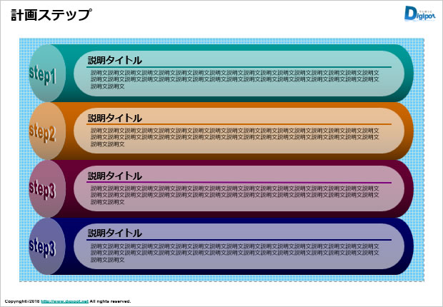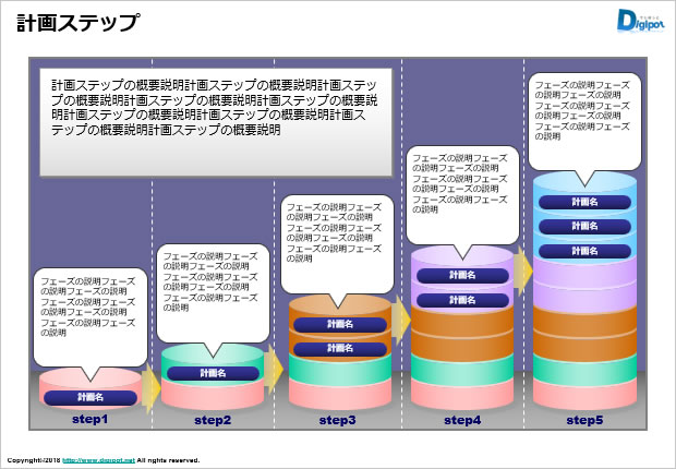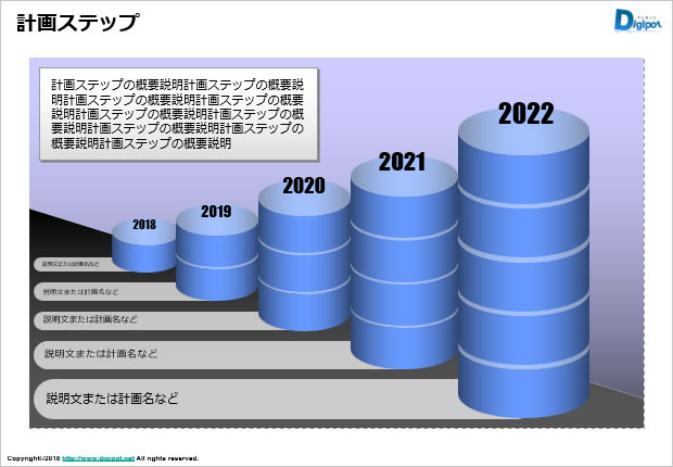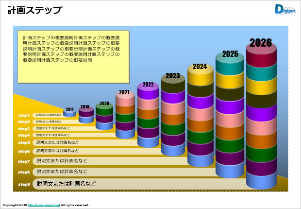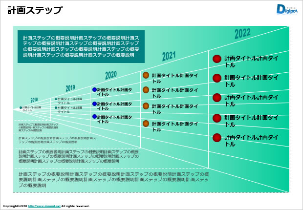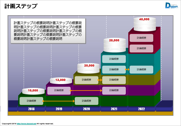 フリー、無料で使える年度別計画ステップ表テンプレート画像です。年度別の計画表です。パワーポイントPPTX形式で作成しています。