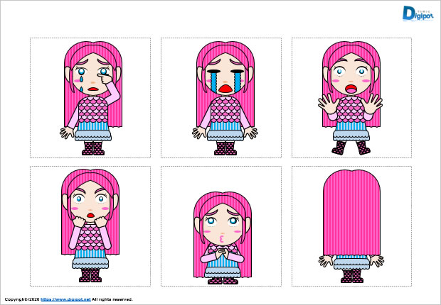 アマビエ風の女の子キャラクターイラスト、マスク着用のアマビエちゃん、怒るアマビエちゃん、笑うアマビエちゃん、泣くアマビエちゃん、頭を下げるアマビエちゃん、すねるアマビエちゃん、ビックリするアマビエちゃん、後ろ姿のアマビエちゃんなど12種類
