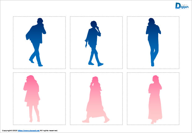歩き通話する人物のシルエット、歩きながらスマホ、白黒、グラデーションなど12種類