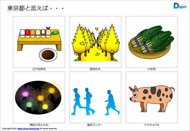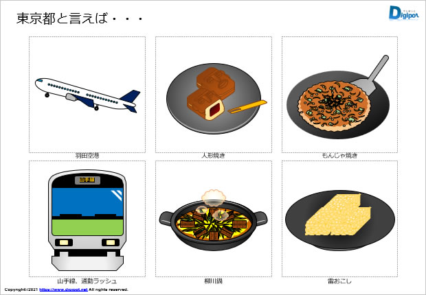 東京都と聞いてイメージするイラスト集と、それらをA4にまとめたPPTX資料です。イラストはPNG形式も用意しております。