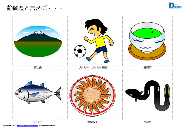 静岡県と言えばをまとめた資料、静岡県をイメージするイラスト、富士山、サッカー、静岡茶、カツオ、浜松餃子、うなぎ、うなぎパイ、さくら御飯、富士宮やきそば、シソ、熱海温泉、富士サファリパーク、水ワサビ、黒はんぺん、チンゲンサイ、浜松城、遠州新居手筒花火、浜松まつりなど18種類
