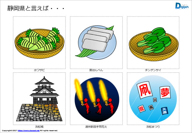 フリー、無料で使える静岡県をイメージするイラスト画像と静岡県の特産や名産、地域行事やイメージを紹介する資料サンプルです。パワーポイントPPTX形式データとPNG透明ファイル形式のイラストを用意しています。資料作成のテンプレートや各種素材にご活用ください。