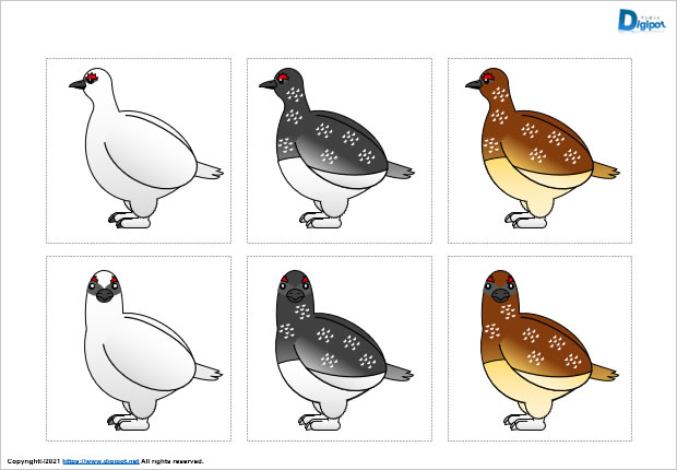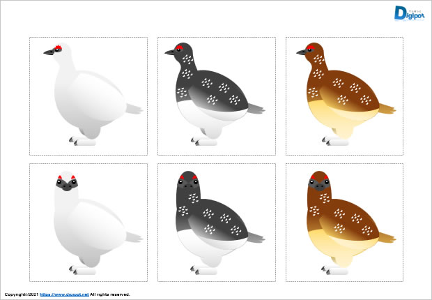 ライチョウ、雷鳥のイラスト。こっちを見ているライチョウ、各種カラー、フチ有りフチ無しなど12種類