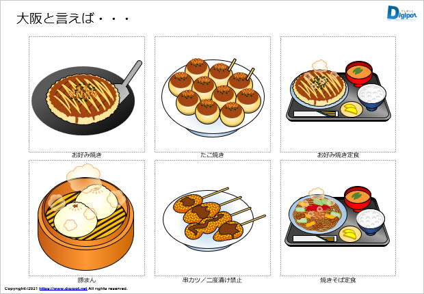 大阪府と聞いてイメージするイラスト集と、それらをA4にまとめたPPTX資料です。イラストはPNG形式も用意しております。