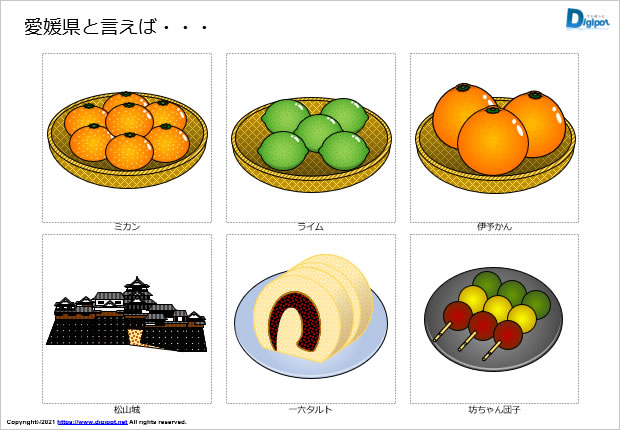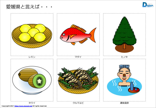 愛媛県と言えばをまとめた資料、愛媛県をイメージするイラスト、みかん、ライム、伊予かん、松山城、一六タルト、坊ちゃん団子、レモン、マダイ、ヒノキ、キウイ、クルマエビ、道後温泉など12種類
