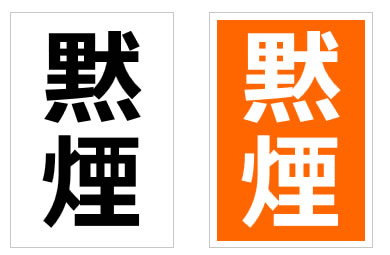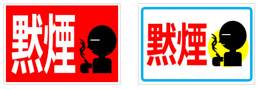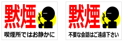 「黙煙」の文字だけと「黙煙」の文字とアイコン風イラスト、枠有、枠無し、白黒、イラストアイコン付き、A4サイズ縦横など12パターン。