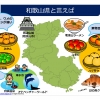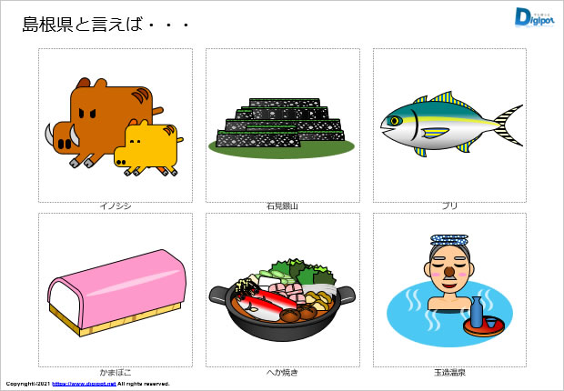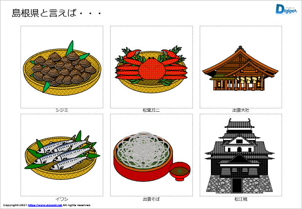 島根県と言えばをまとめた資料、島根県をイメージするイラスト、シジミ、松葉ガニ、出雲大社、イワシ、出雲そば、松江城、イノシシ、石見銀山、ブリ、かまぼこ、へか焼き、玉造温泉など12種類