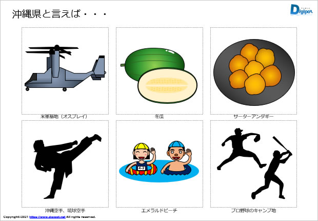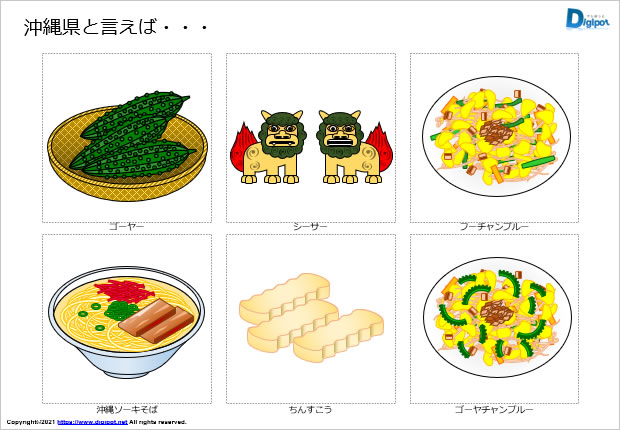 沖縄県と言えばをまとめた資料、沖縄県をイメージするイラスト、ゴーヤー、シーサー、フーチャンプルー、沖縄ソーキそば、ちんすこう、ゴーヤチャンプルー、サトウキビ、黒糖、クレソン、パイナップル、マンゴー、ドラゴンフルーツ、米軍基地(オスプレイ)、冬瓜、サーターアンダギー、沖縄空手、琉球空手、エメラルドビーチ、プロ野球のキャンプ地など18種類