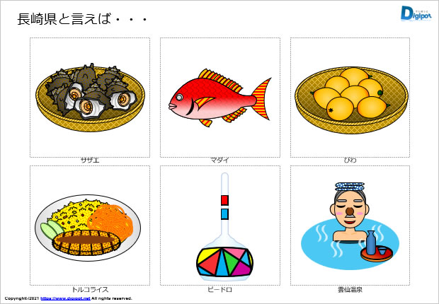 長崎県と言えばをまとめた資料、長崎県をイメージするイラスト、長崎ちゃんぽん、カステラ、眼鏡橋、端島(軍艦島)、精霊流し、対馬、サザエ、マダイ、びわ、トルコライス、ビードロ、雲仙温泉など12種類