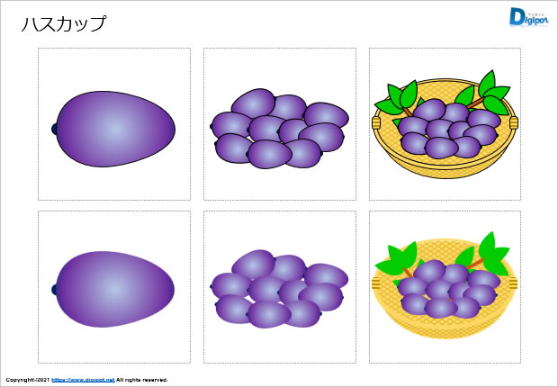 ハスカップのイラスト、かごに入ったハスカップ、フチ有りフチ無しなど6種類