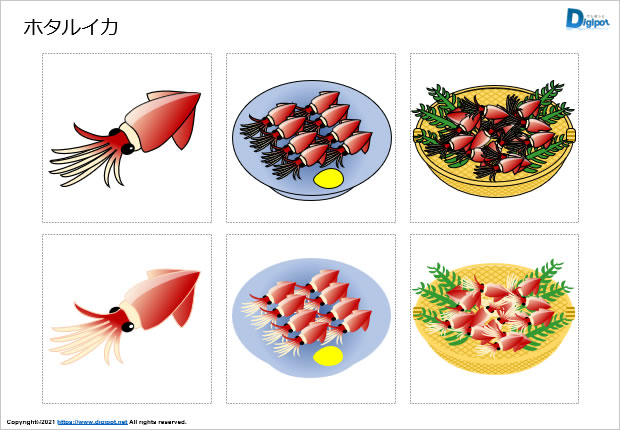 ホタルイカのイラスト、かごに入ったホタルイカのイラスト、お皿に乗ったホタルイカのイラスト、フチ有りフチ無しなど6種類
