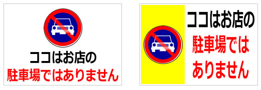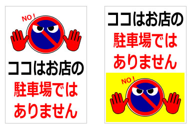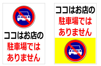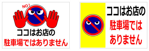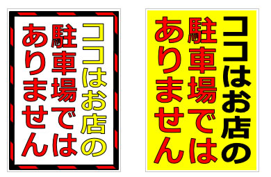 「ココはお店の駐車場ではありません」の文字だけと「ココはお店の駐車場ではありません」の文字とアイコン風イラスト、枠有、枠無し、白黒、イラストアイコン付き、A4サイズ縦横など12パターン。