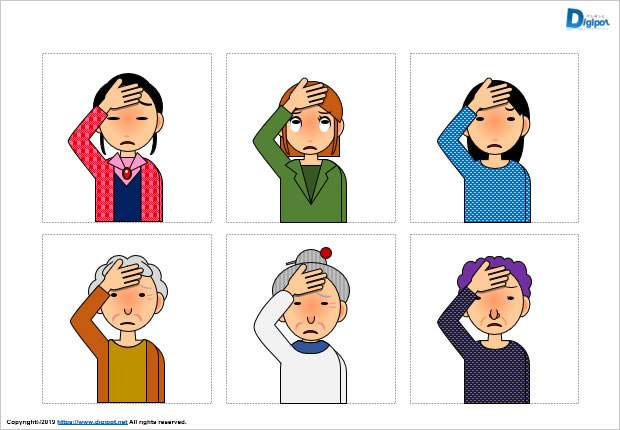 発熱を気にする女性のイラスト、熱をはかる、額に手をあてる、気分が悪い、おばあちゃん、OL、フチ有りフチ無しなど12種類