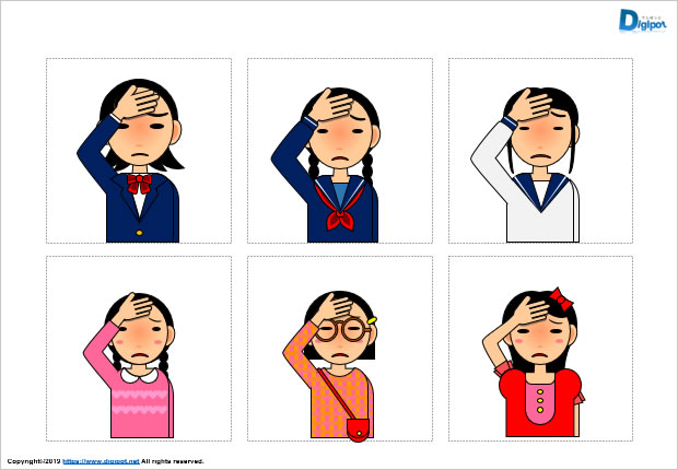 発熱を気にする女の子のイラスト、熱をはかる、額に手をあてる、気分が悪い、小学生、中高生、フチ有りフチ無しなど12種類