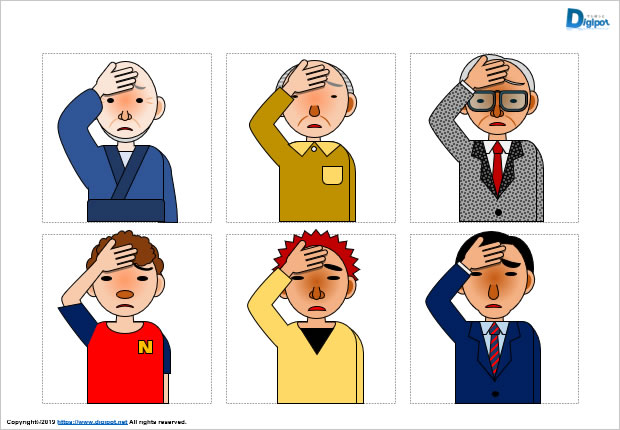 発熱を気にする男性のイラスト、熱をはかる、額に手をあてる、気分が悪い、おじいちゃん、フチ有りフチ無しなど12種類