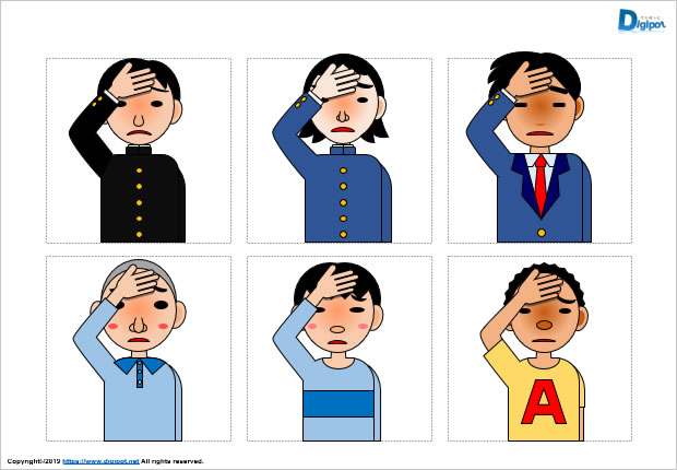 フリー、無料で使える発熱を気にする人物のイラスト画像です。パワーポイントPPTX形式と、パワーポイントから書き出したPNG透明形式ファイル版を用意しています。