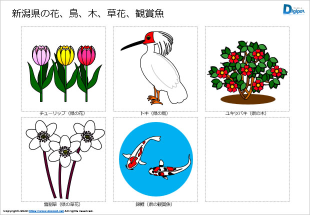 新潟県の花、鳥、木、草花、観賞魚のイラスト、資料内容