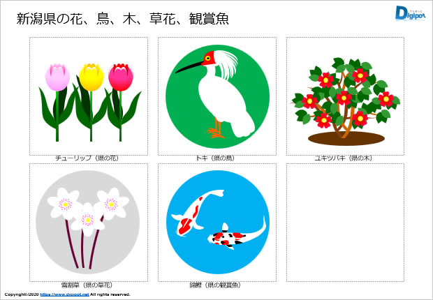 新潟県の花、鳥、木、草花、観賞魚のイラスト(パワーポイント)をダウンロードする
