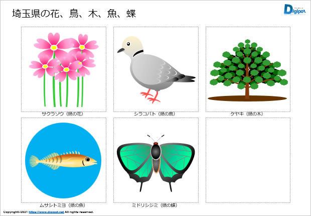 埼玉県の県の花はサクラソウ、県の木はケイヤキ、県民の鳥はシラコバト、県の蝶はミドリシジミ、県の魚はムサシトミヨです。各種埼玉県の資料づくりの素材などにご活用ください。