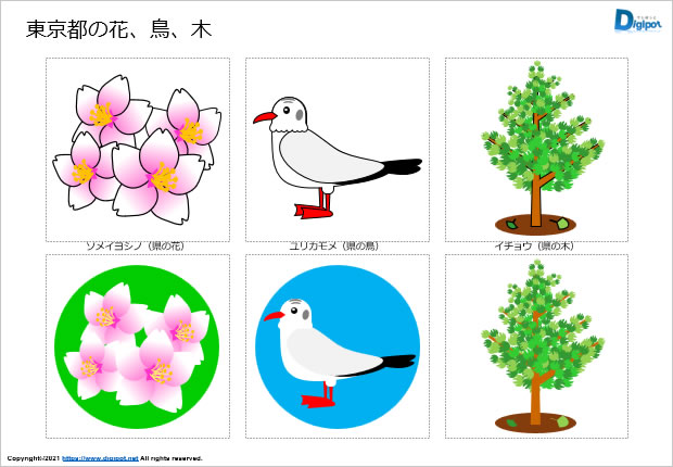 フリー、無料で使える東京都の花、鳥、木のイラスト画像です。パワーポイントPPTX形式データとPNG透明ファイル形式のイラストを用意しています。資料作成やチラシ作成などの素材にご活用ください。
