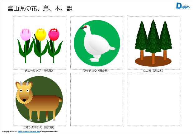 富山県の県花はチューリップ、県木はタテヤマスギ、県鳥はライチョウ、県魚はブリ/ホタルイカ/シロエビ、県獣はニホンカモシカです。各種富山県の資料づくりの素材などにご活用ください。