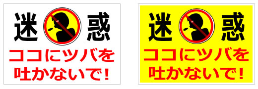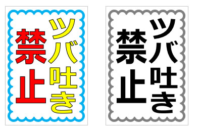 「ツバ吐き禁止」の文字のみ、「ツバ吐き禁止」「迷惑ココにツバを吐かないで!」と文字とイラスト、枠有、枠無し、白黒、イラストアイコン付き、A4サイズ縦横など12パターン。