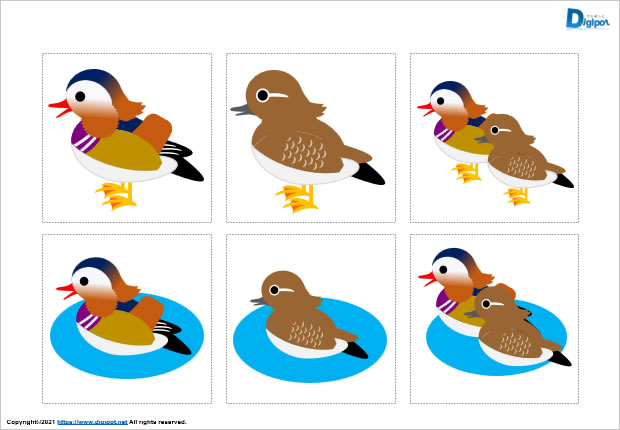 オシドリのイラスト、オシドリのオスとメス、水に浮かぶオシドリ、オシドリ夫婦、フチ有りフチ無しなど12種類