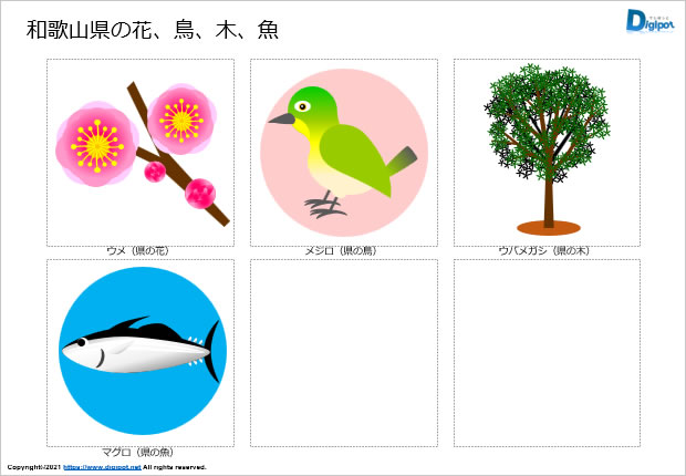 和歌山県の県の花はうめ、県の木はうばめがし、県の鳥はめじろ、県の魚はまぐろです。各種和歌山県の資料づくりの素材などにご活用ください。