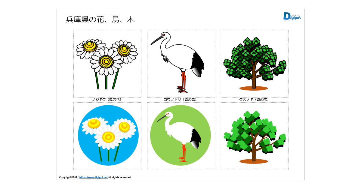 兵庫県の県花はノジギク、県木はクスノキ、県鳥はコウノトリです。各種兵庫県の資料づくりの素材などにご活用ください。