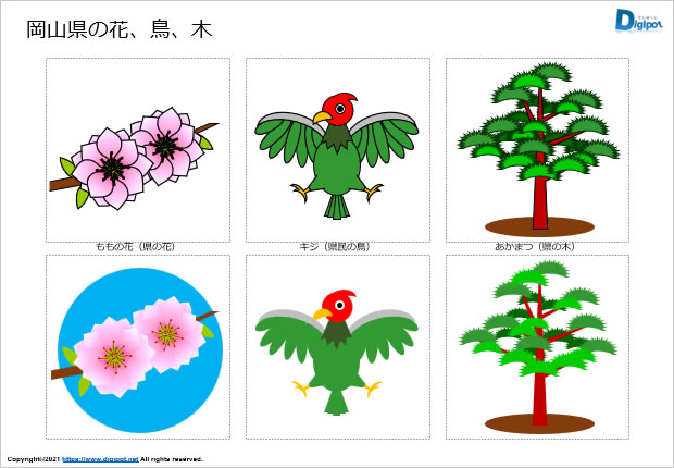 岡山県の県花はももの花、県木はアカマツ、県民の鳥はキジです。各種岡山県の資料づくりの素材などにご活用ください。