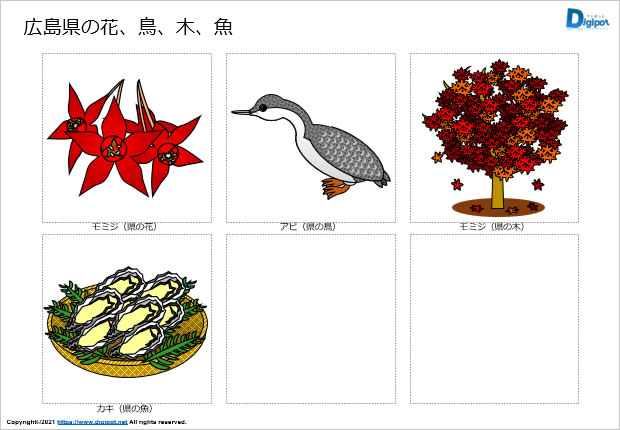 広島県の県の花、県の木はモミジ、県の鳥はアビ、県の魚はカキ。各種広島県の資料づくりの素材などにご活用ください。※県の花モミジは正式ではありません。
