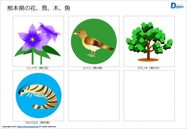 熊本県の県花はリンドウ、県木はクスノキ、県鳥はヒバリ、県魚はクルマエビです。各種熊本県の資料づくりの素材などにご活用ください。