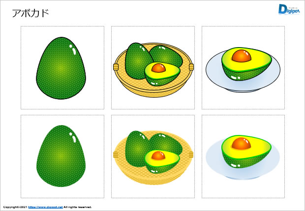 フリー、無料で使えるアボカドのイラスト画像です。パワーポイントPPTX形式と、パワーポイントから書き出したPNG透明形式ファイル版を用意しています。