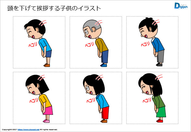 礼儀正しく背筋を伸ばしてぺこりとお辞儀する子供キャラクターを、複数の角度や手の位置バリエーションで収録。学校のマナー教育資料、イベントの来場者案内、町内会のチラシなどで「正しい挨拶」のお手本として活用できます。