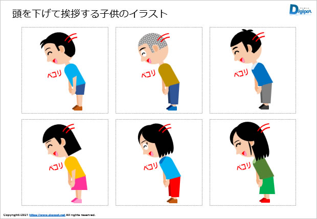 フリー、無料で使える頭を下げて挨拶する子供のイラスト画像です。パワーポイントPPTX形式と、パワーポイントから書き出したPNG透明形式ファイル版を用意しています。