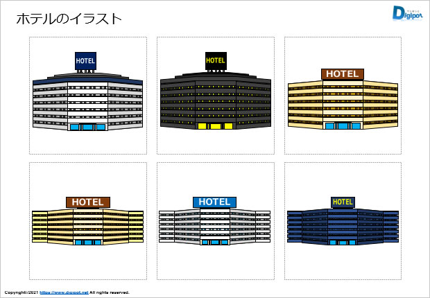 ホテルのイラスト、リゾートホテル、ビジネスホテル、夜のイメージ、各種配色、フチ有フチ無しなど12種類