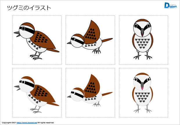 ツグミのイラスト、飛んでいるツグミ、正面から見たツグミ、フチ有フチ無しなど6種類